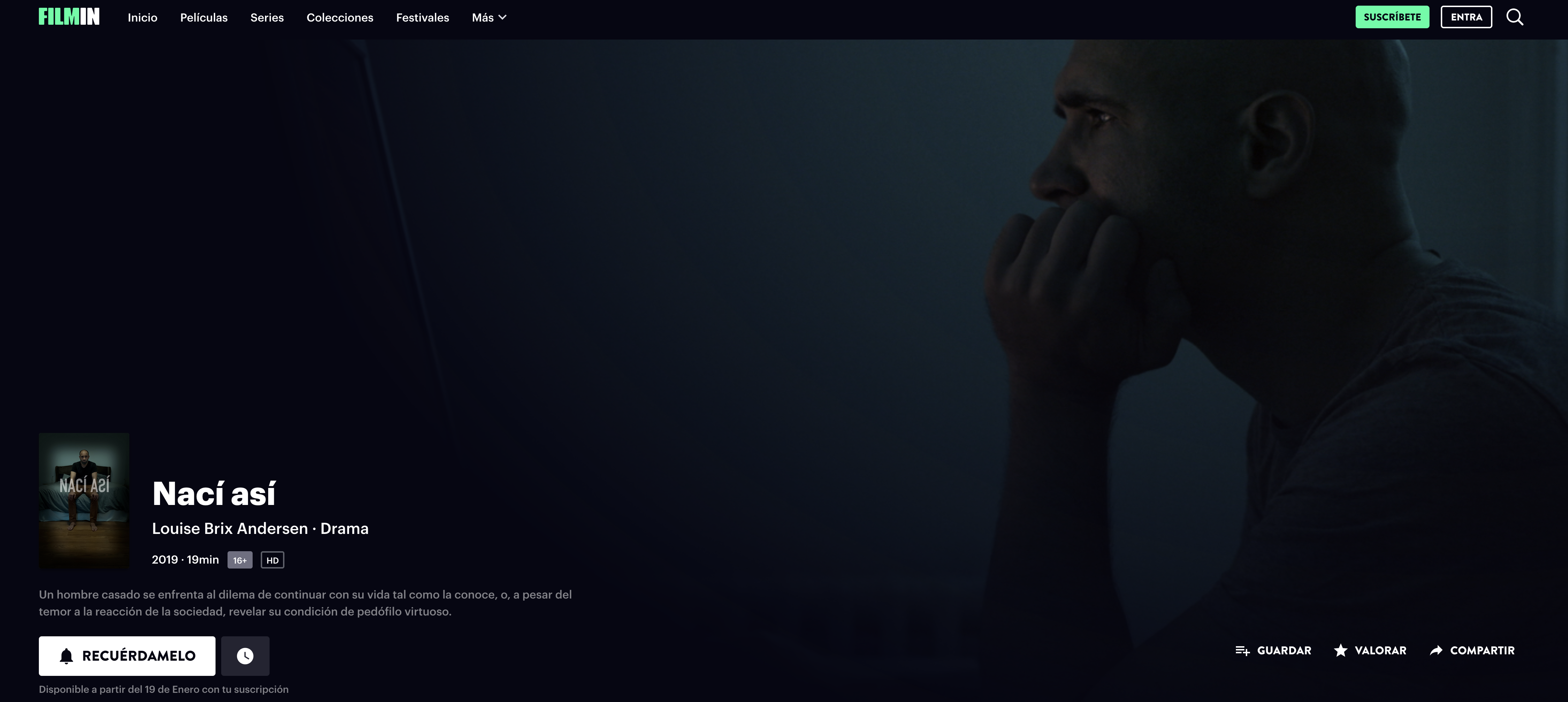NACÍ ASÍ is a short but complex drama, written and directed by Louise. The film deals with a very difficult subject, exploring how a virtuous pedophile, who has no intentions of ever acting out on his sexual desires, can live and function in our society.